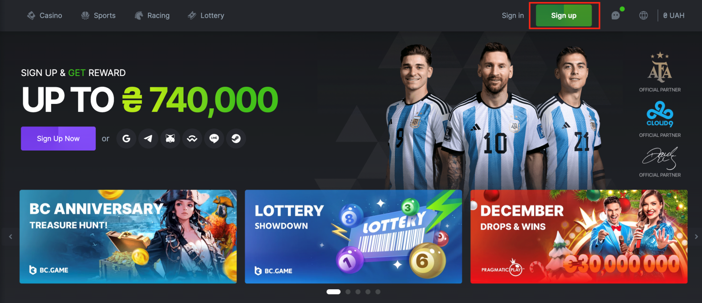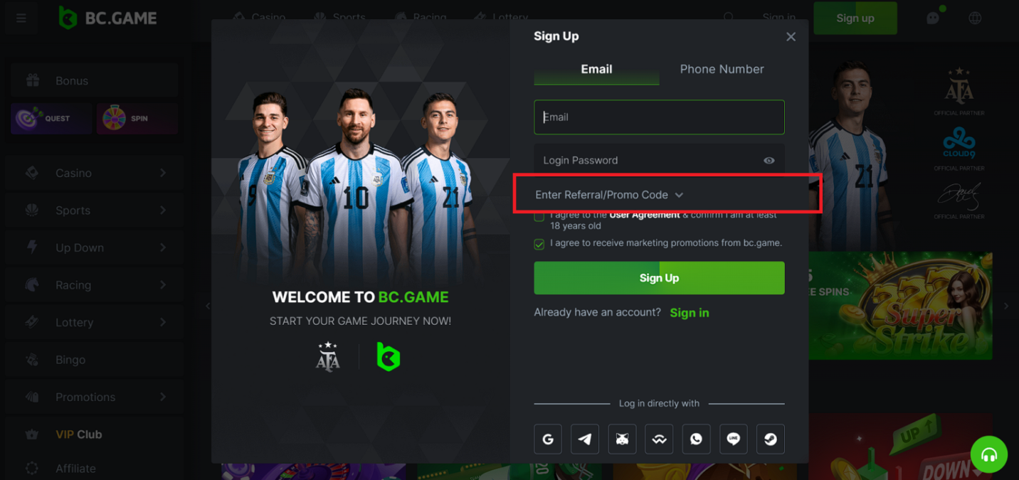Activating a BC.Game promo code, like “csgobettings”, is easy because aspiring users have several sign-up avenues to choose (the easiest is via partner platforms like Google and Telegram). Here’s how.
