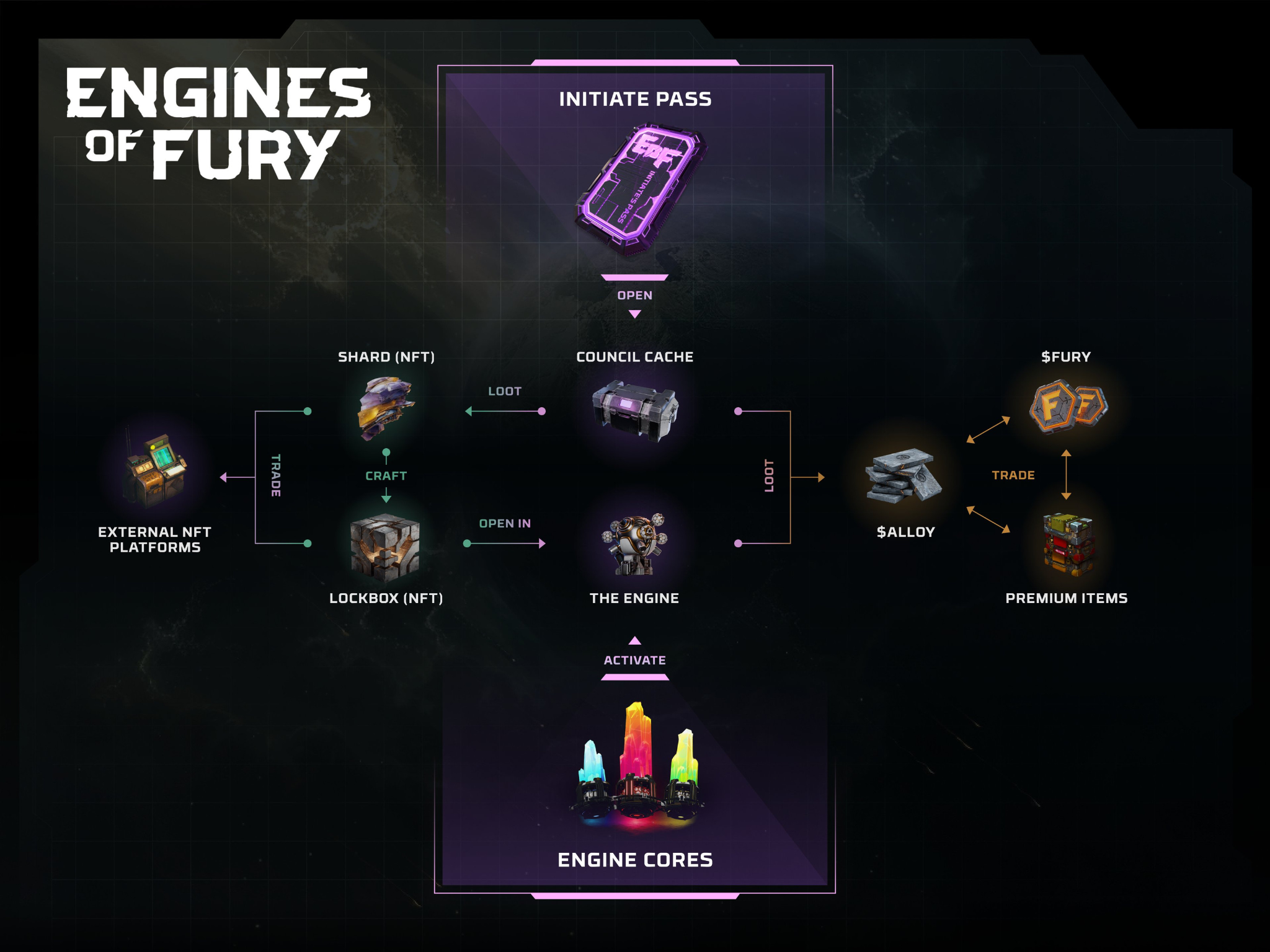 A reward event with a maximum pool of $1,000,000 $FURY will be held by Engines of Fury in the first month following debut. The best 1:1 rate is available to early participants, who can earn ALLOY and exchange it for $FURY. Various in-game activities, such defeating opponents, accessing caches, or creating unique Lockboxes, yield rewards.