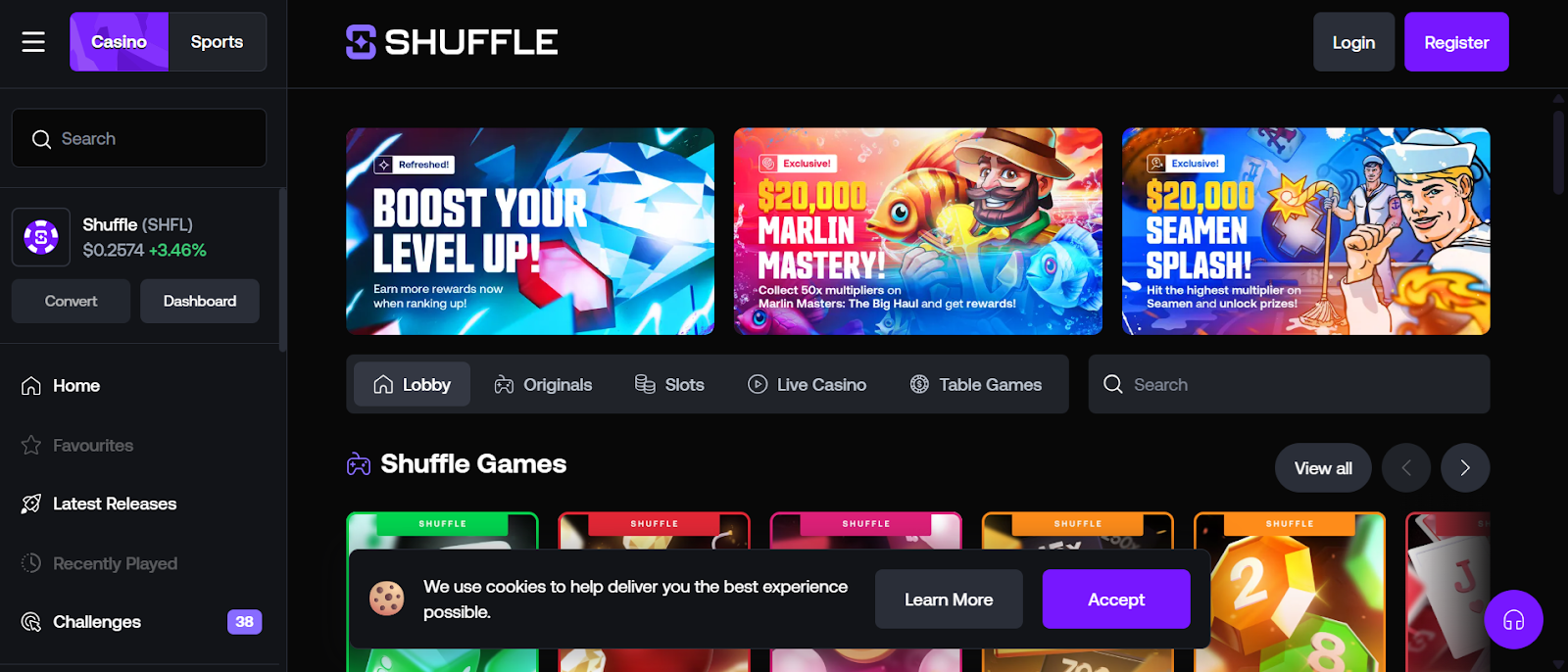 Since its 2023 launch, Shuffle has gained a following that loves its smooth desktop/mobile navigation, and support of major cryptocurrencies like Bitcoin, Ethereum, USDT, and XRP. Players can enjoy 2,500+ games, including slots, live dealer tables, and provably fair originals from top studios like Evolution and Nolimit City. Shuffle also has a sportsbook and esports betting. Web3 wallet support and VPN access add extra appeal for those privacy-conscious users among us.