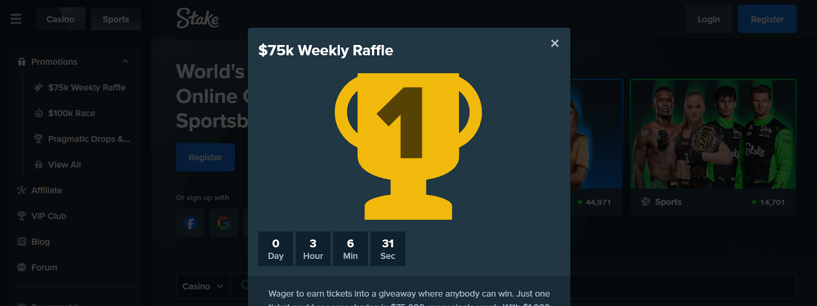 Stake’s flagship $75,000 Weekly Raffle awards cash prizes to 15 winners every week. For every $1,000 you bet, you automatically earn one ticket into the draw, with winners announced live during Eddie’s stream every Saturday at 2pm GMT.