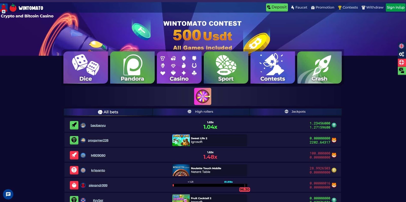 One thing that really makes Wintomato stand out is its fun loyalty system and regular, rewarding promos. Players can join in hourly, daily, and weekly contests that offer them chances to win free spins, bonuses, and cash prizes. The platform also includes a faucet feature, allowing users to claim free crypto up to 40 times a day, with rewards increasing as players level up. Wintomato also has a tipping system so players can choose to share their winnings with others, meaning there’s a real sense of community-building on this site.