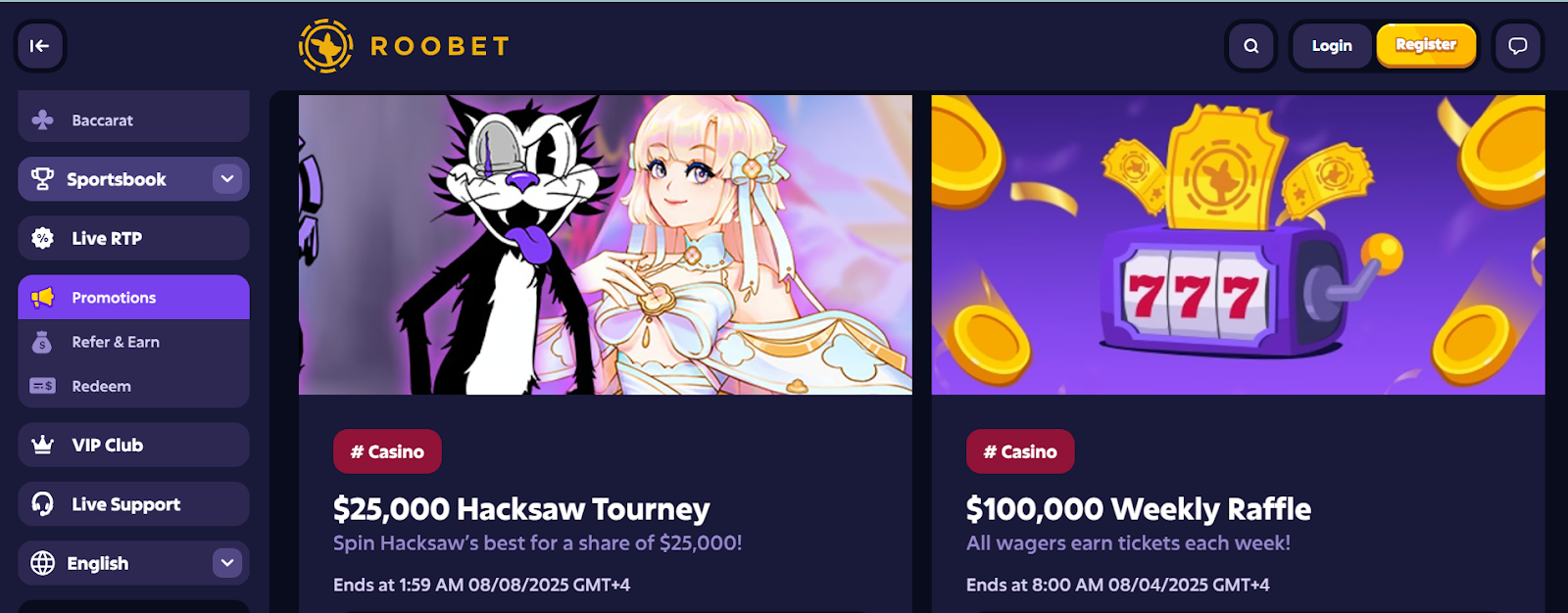 Roobet has a 20% cashback offer on net slot losses for the first seven days after you register. This is paid in cash, with no wagering limits, though there is a cap on payout. The site also offers continuous prize drops, casino races, VIP leaderboards, tournaments, and seasonal campaigns with impressive prize pools, such as the $200K Hot Shots and Blackjack League events. These pools are usually tied to major sporting seasons and streamer-hosted draws.