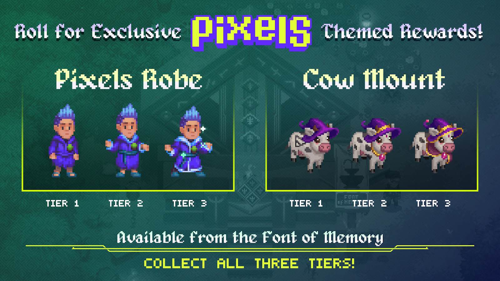 The event also brings special, limited-time rewards. The Font of Memory has been updated with Pixels-themed items, and they are mintable. This means you can keep these items forever. Some of the exclusive items up for grabs include: