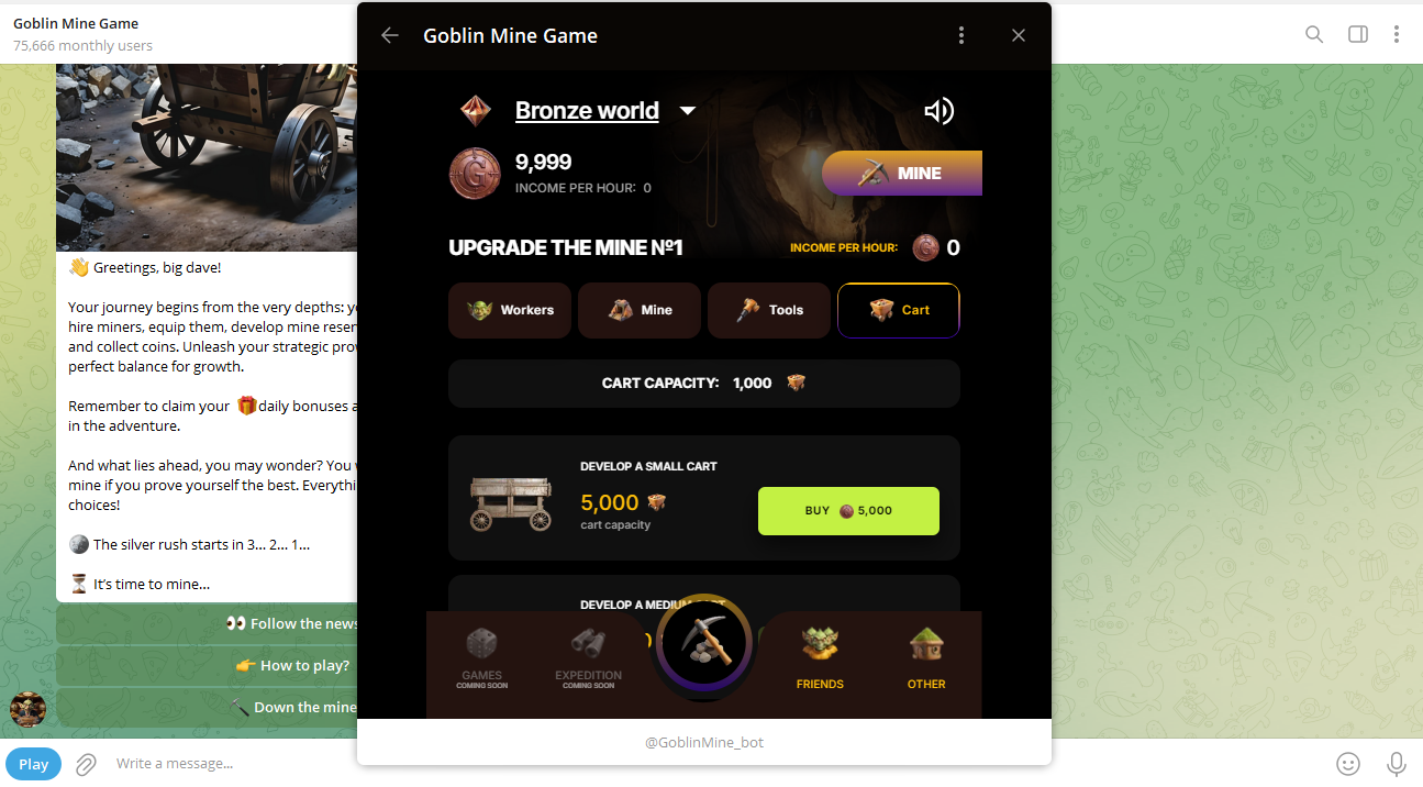 - Starting the Game: First, open Telegram and launch the Goblin Mine bot through their official link. You will be offered your first mine and 10,000 coins to start. The game interface is simple to navigate, at the top of the bot homepage, you will see the bronze and the silver world options. Also, you will see the sound option, which you can choose to mute or unmute; you will also get to see your income per hour, reserves per day, miners, cart capacity, and the upgrade option.