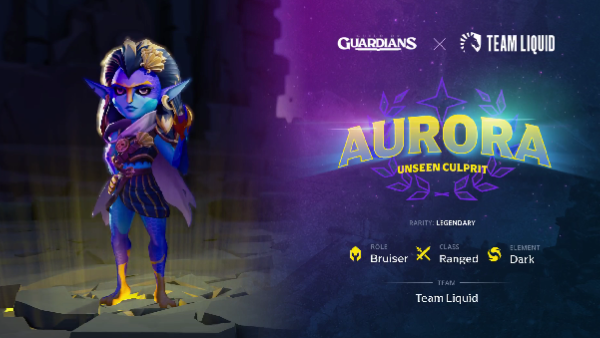 One example of these exclusive characters is Aurora, the guardian reveals for Team Liquid. Aurora is described as the “Unseen Culprit,” and will be representing Team Liquid as a playable hero in-game. The character’s specifics are also revealed alongside the character. She looks to be a bruiser-ranged type with dark as her element.