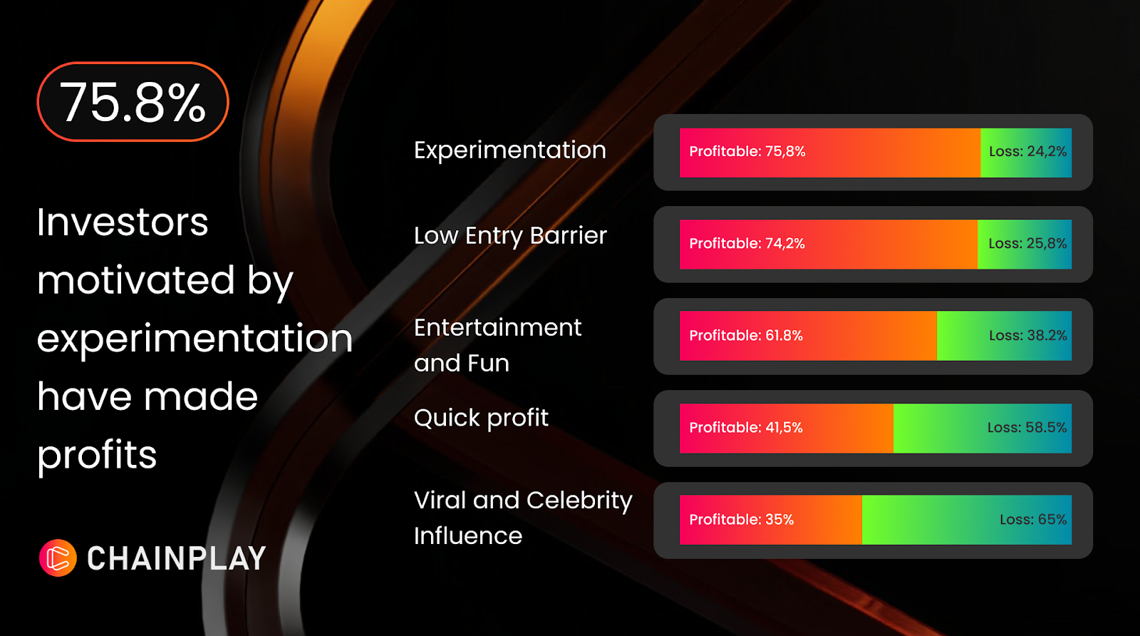 - In terms of motivations, investors engaging for experimental reasons achieved the highest success rate at 75.8%, while those motivated by celebrities had the lowest at 35%.