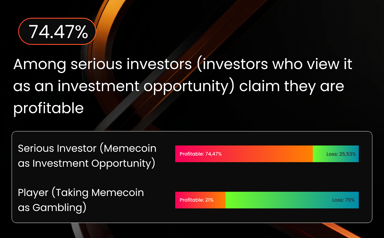 - 74.47% of serious investors (trade memecoins as an investment opportunity) are profitable, whereas only 21% of players (trade mainly for entertainment or gambling) achieve profits.