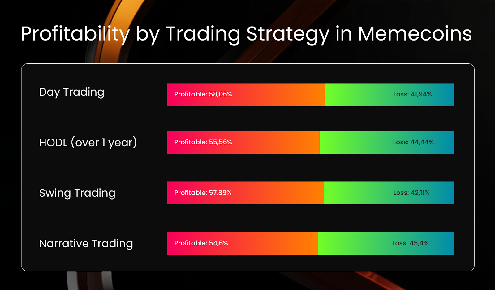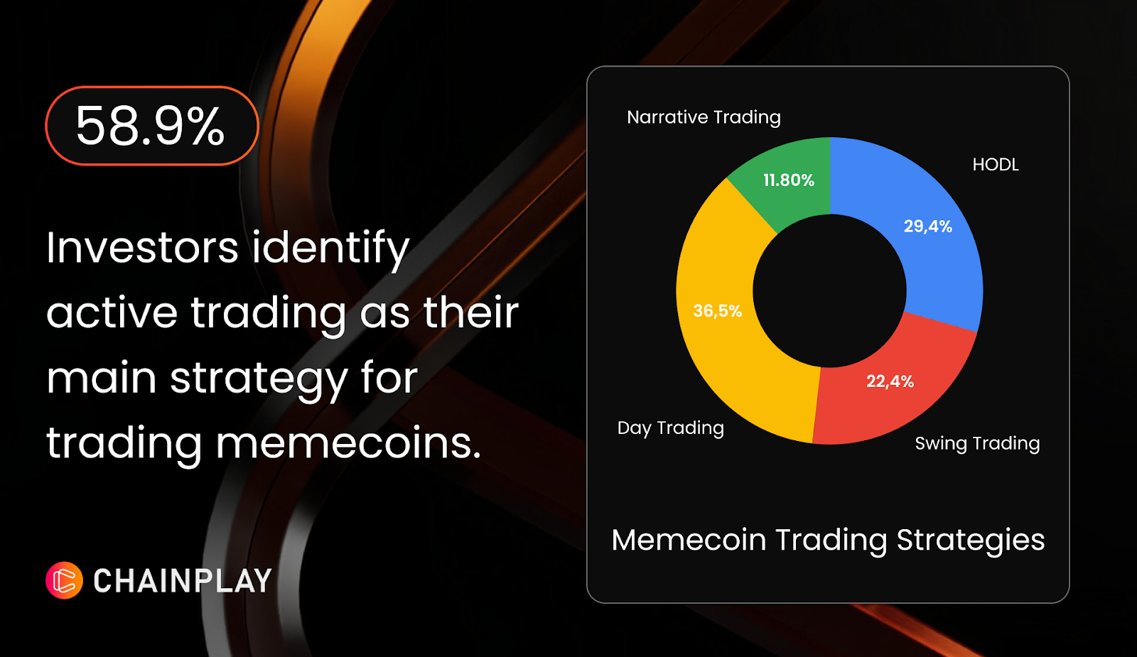 36.5% of memecoin investors are day traders, and 22.4% are swing traders, meaning nearly 59% use active trading strategies.