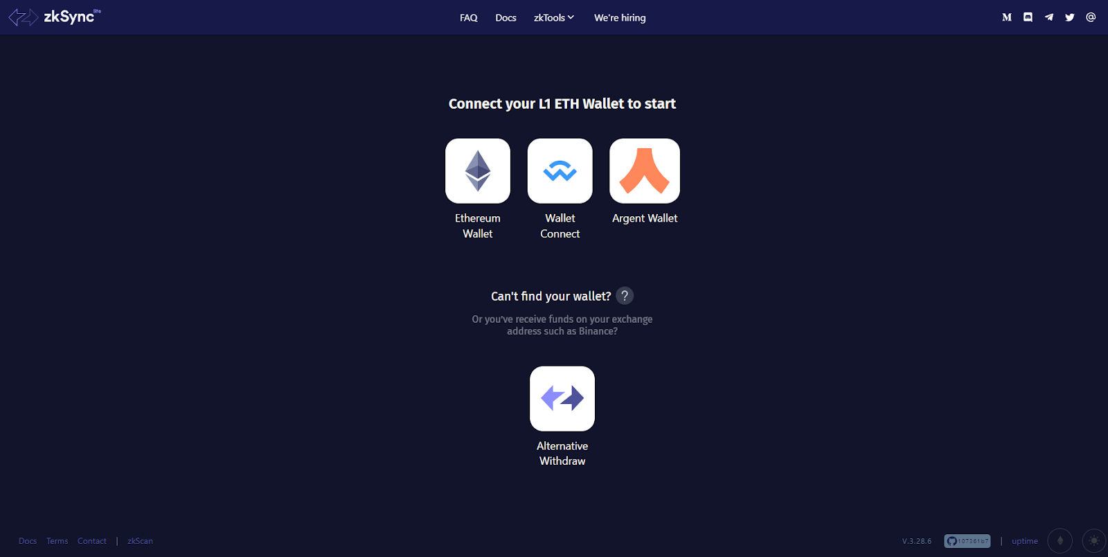 a. Visit the zkSync wallet website: Go to https://wallet.zksync.io/ and you will see the homepage requiring you to connect to an L1 wallet.