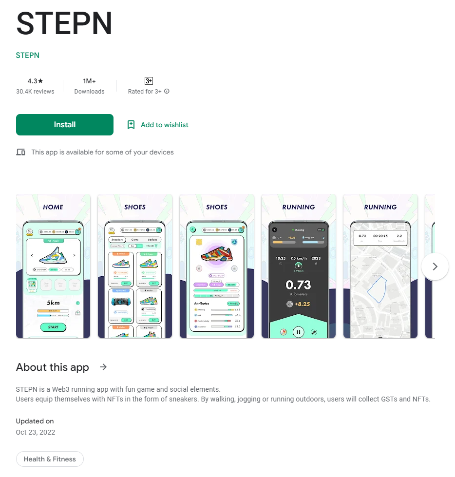 STEPN is the leading move-to-earn Web 3.0 app that combines SocialFi and Gamefi elements. The STEPN app is revolutionizing the future of exercising and workouts.