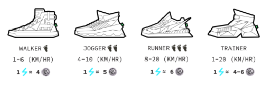 You can select from one of these four shoe classes with varying earning efficiency depending on your chosen speed of movement.