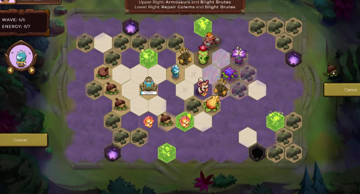As seen from the illustration, enemies will spawn on the purple portal and will follow a purple line, indicating its path of attack. The objective of Everseed is to prevent your health from reaching zero(Survive!). Players will need to defend their blue core from enemies by strategically placing their units on each hexagon available on the map.