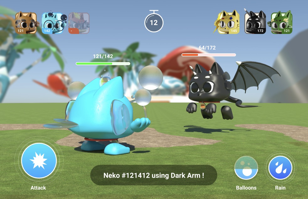 Neko characters can fight against other players in Real-Time Skill-based battle modes such as 1v1, 3v3, and tournaments.