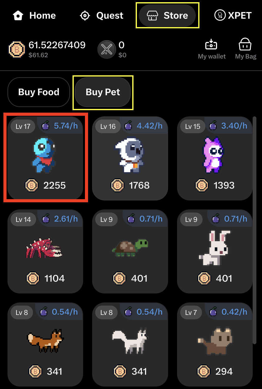 4. To facilitate its evolution, you’ll require XPET or BPET, both obtainable through purchase (https://fi.xpet.tech/) or by earning them for free via daily quests.