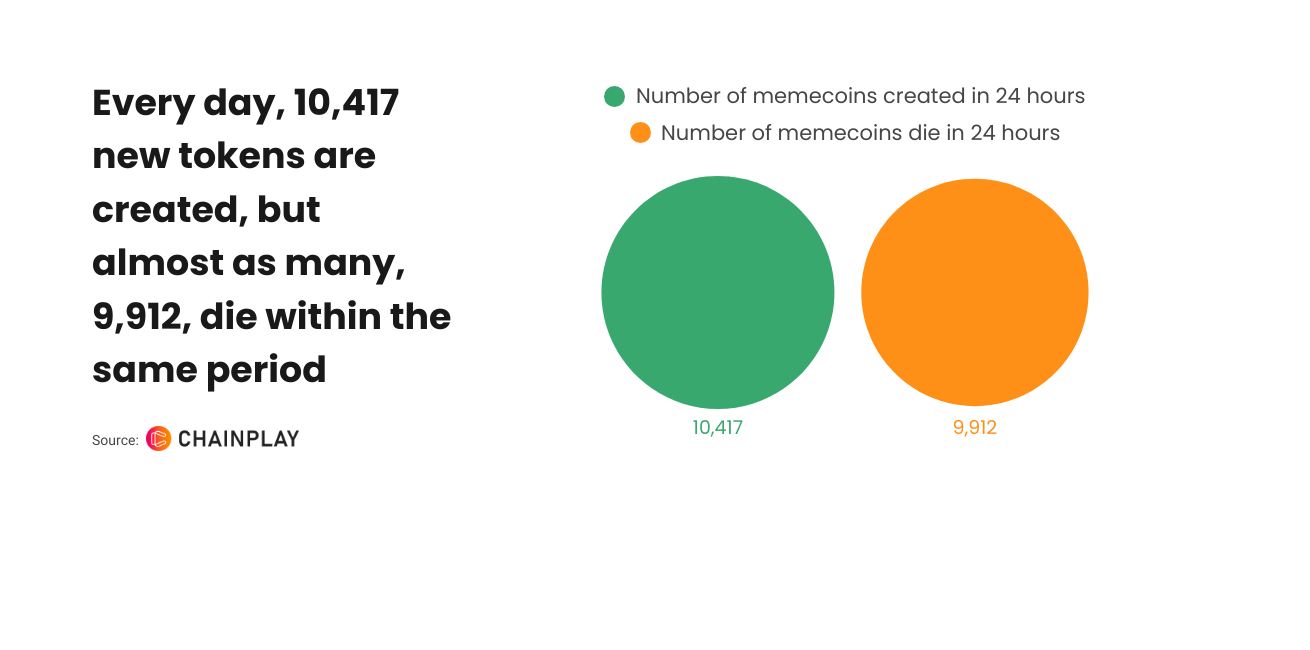 The memecoin ecosystem on Pump.fun is in a constant state of flux. Every day, 10,417 new tokens are created, but almost as many, 9,912, die within the same period. This means that the platform is operating with a near 95% turnover rate—essentially, most memecoins have a fleeting lifespan.
