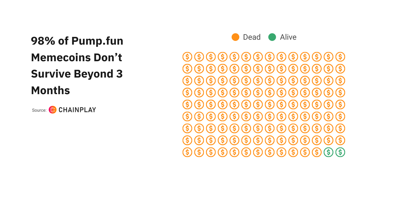 - 98% of memecoins on pump.fun fail to survive longer than 3 months.