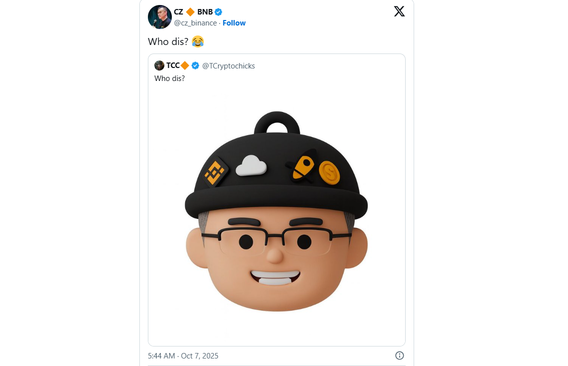 On Tuesday, October 7, a crypto enthusiast, TCryptochicks, posted this cartoon avatar of CZ on X, with the caption, “Who dis?” CZ reacted to the post with “Who dis? .” In a surprising move that appeared like an endorsement, CZ also shared the original tweet.
