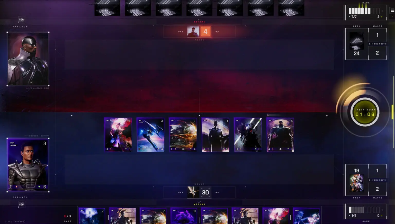 Parallel introduces a unique mana/energy system that requires players to “bank” cards from their hand, providing additional maximum energy each turn. Starting with zero energy, players must bank at least one card per turn. This approach encourages strategic decision-making while rewarding players with an extra card draw when they bank a card during their turn.