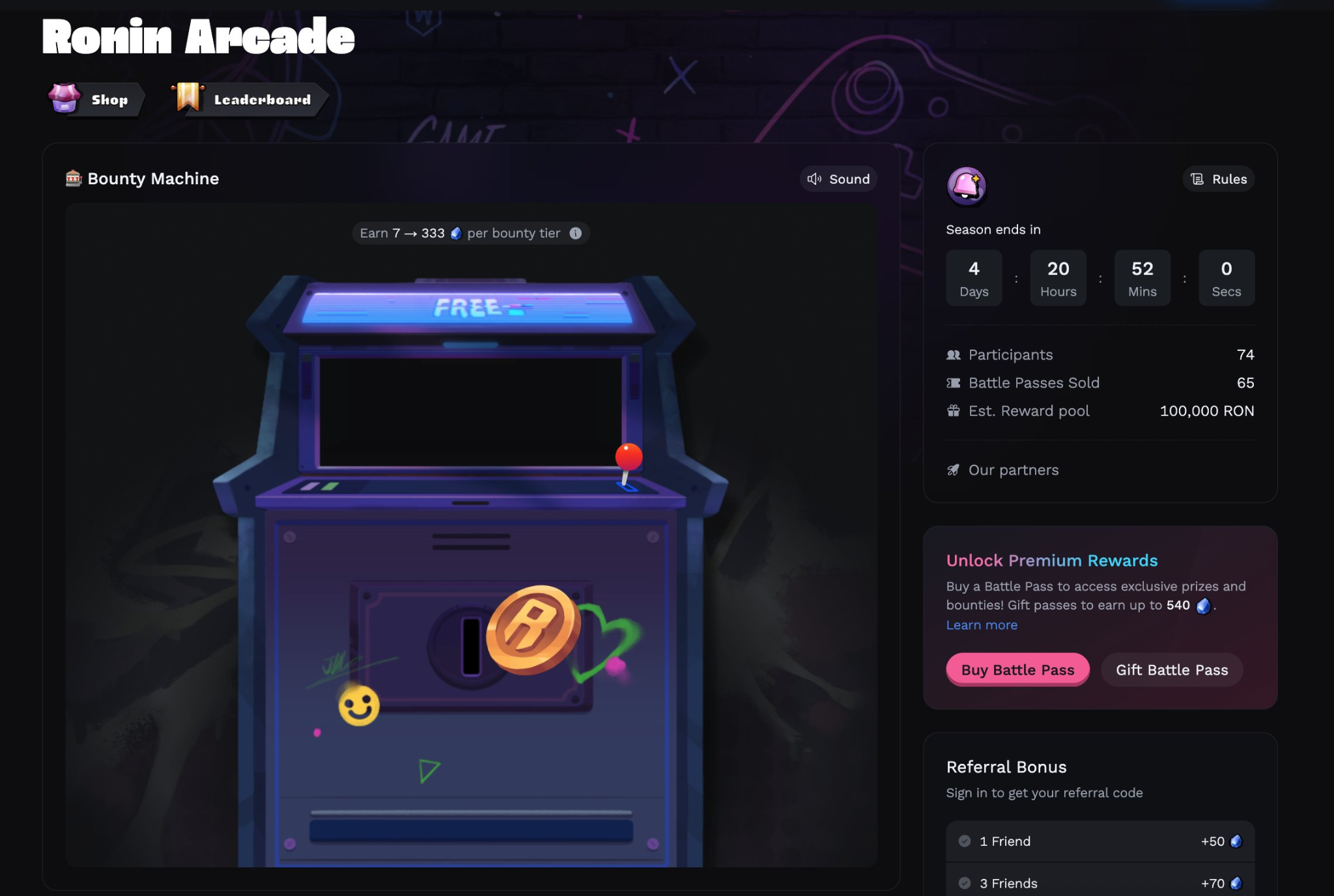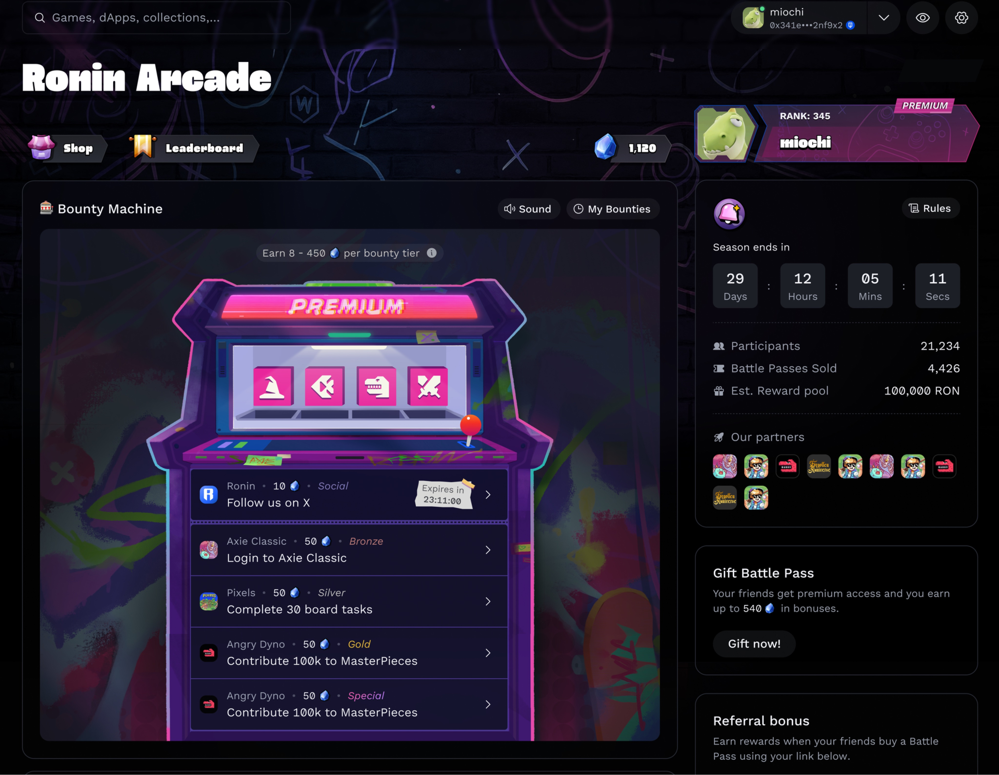 Players log in through a connected wallet. They can play for free or buy a Premium Battle Pass for 25 RON. The Battle Pass unlocks more quests, higher point caps each week, and access to a Premium Shop. Free players can do a limited set of tasks. Pass holders can claim bigger rewards through Silver, Gold, and Special Quests.