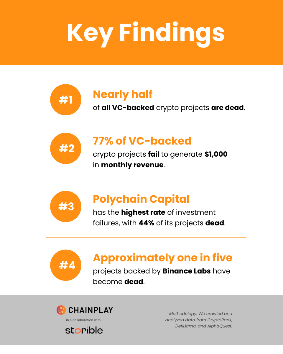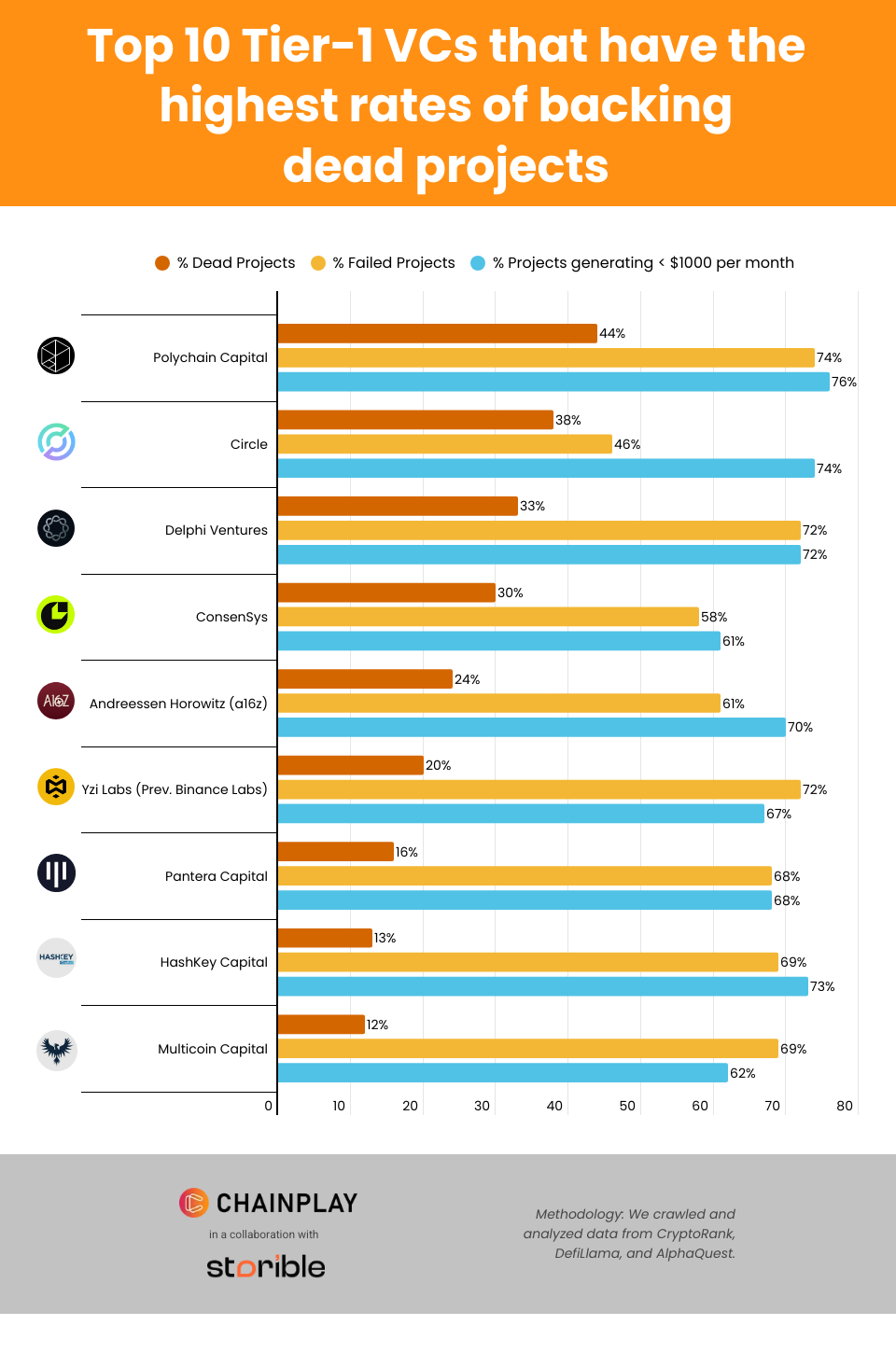 - Polychain Capital has the highest rate of investment failures, with 44% of its projects dead.