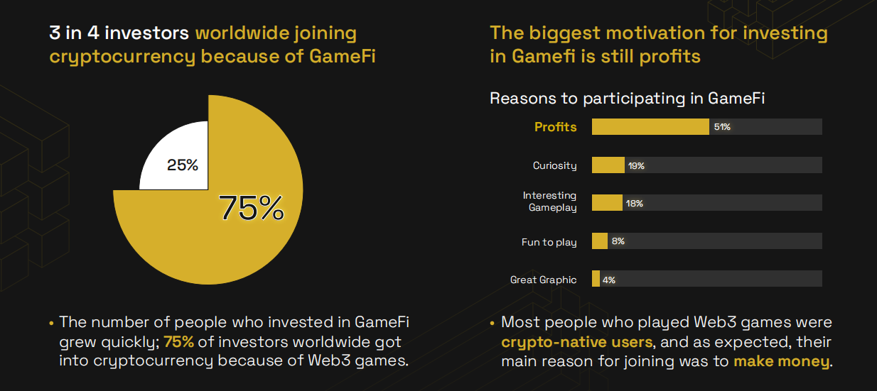 Furthermore, profits were cited as the primary reason for this trend, with 51% of respondents mentioning that profits were the biggest motivation for Investing in GameFi.