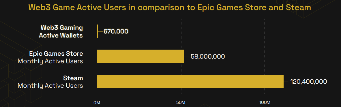 As of 2022, the market share of GameFi is significantly less than traditional games. Web2 games currently have 245 times more on Google Play and 180 times more active users on Steam, demonstrating how young the Web3 gaming industry is.