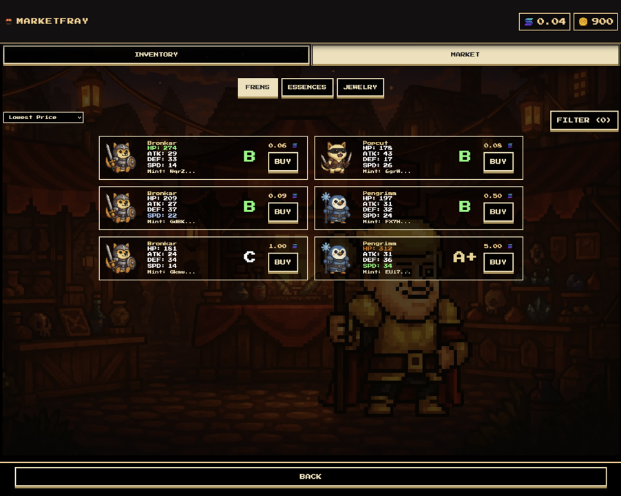 In Battlefrens, every player commands a unique Fren, a warrior inspired by the mascots of iconic memecoins and reborn in a universe that blends medieval fantasy and futuristic technology. Each Fren can be customized and strengthened through a deep system of crafting, equipment, and upgrades. Collect materials from battles, forge powerful rings and trinkets, and awaken your Fren’s hidden potential to climb the ranks and dominate your opponents.