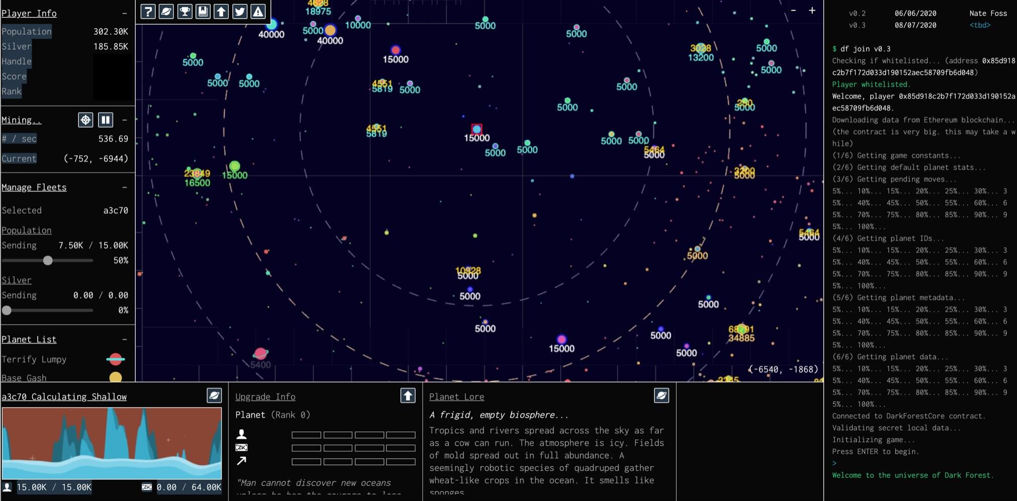 Dark Forest is an MMO space-conquest game where players discover and conquer planets in an infinite, procedurally-generated, cryptographically-specified universe.