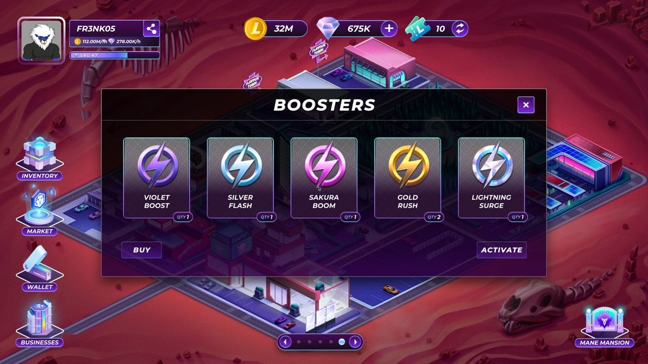 Loaded Lions: Mane City is a tycoon-style game powered by Cronos. Each player is an entrepreneur with the goal of building and designing their dream city and mansion. The rewards earned from gaining experience points along with the strategic placements of Businesses in the game can ultimately be exchanged for CRO.