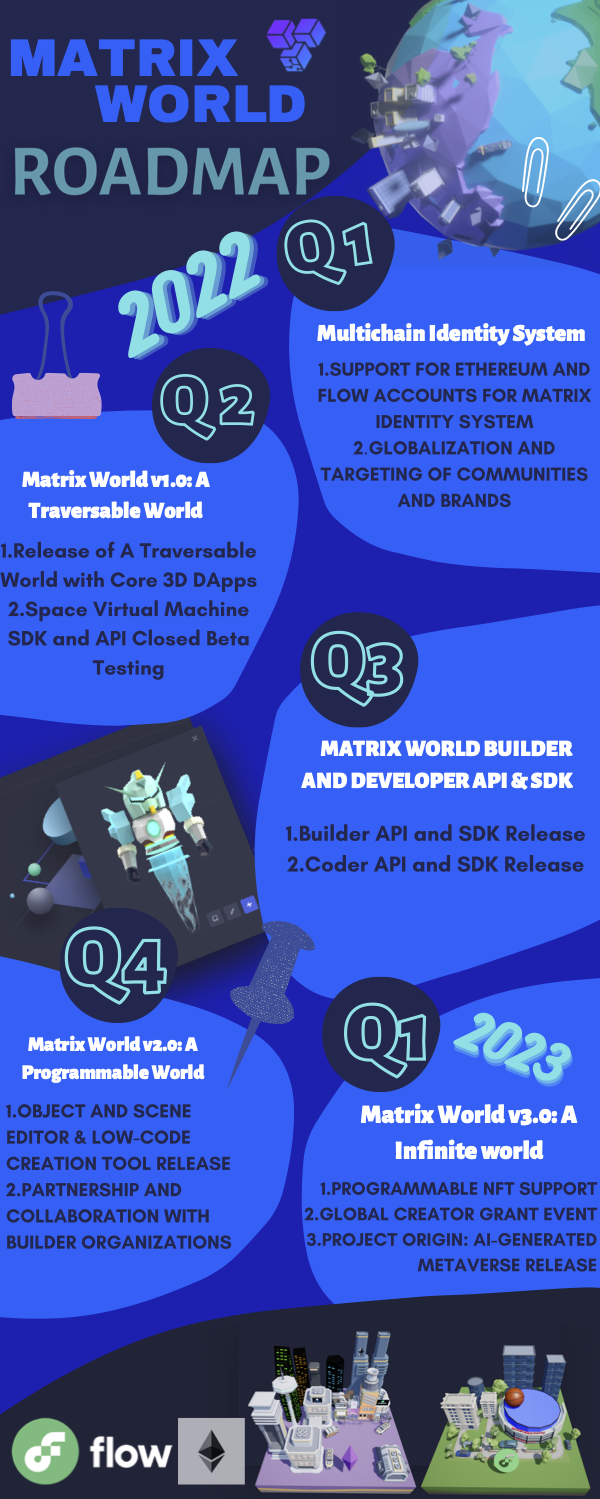 Matrix World is a decentralized open virtual world that lets users interact with immersive 3D applications simultaneously running on different blockchains. The world consists of Lands, issued as Non-Fungible Tokens (NFTs), which permanently persist on blockchain networks such as Ethereum and Flow.