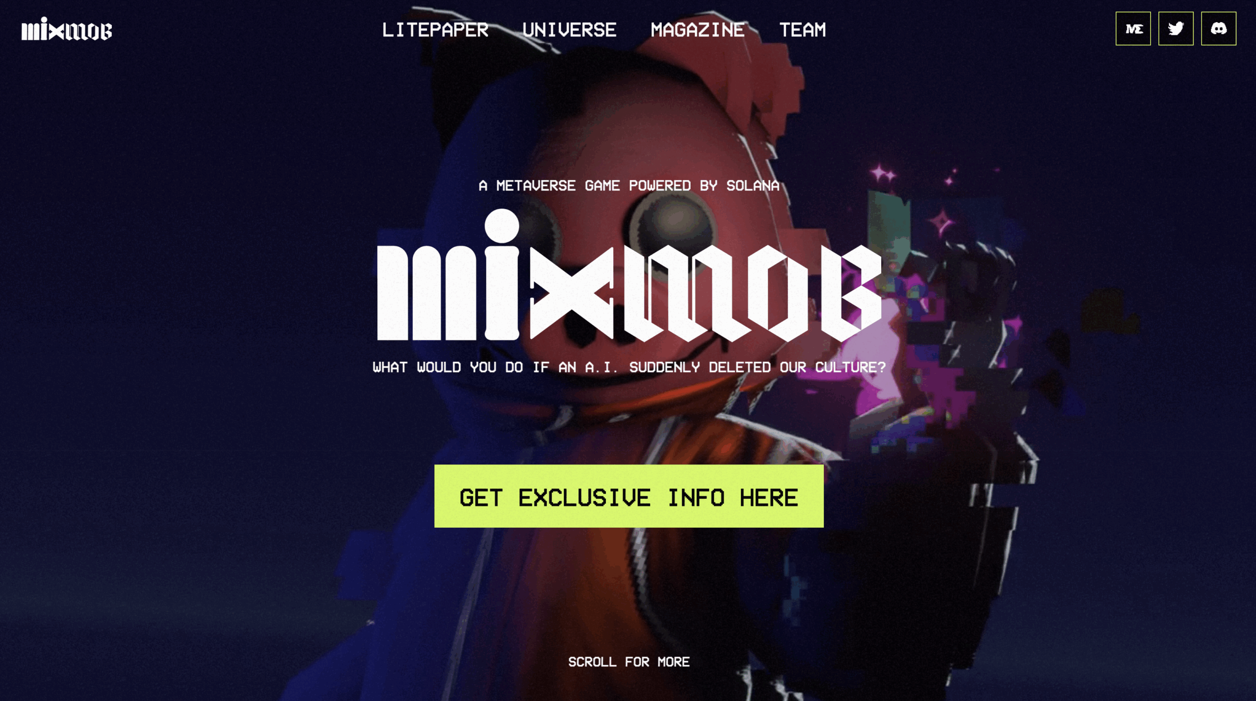 MixMob is set in a universe where a mysterious A.I. deletes the world’sculture and locks away their prized NFTs in an impenetrable vault, enslaving humanity with an army of bots and a mysterious energy field that wipes their memories. Players are part of a creative resistance group that escaped underground into the Subdomains. Their mission: to regroup, fight back, and rechain culture.