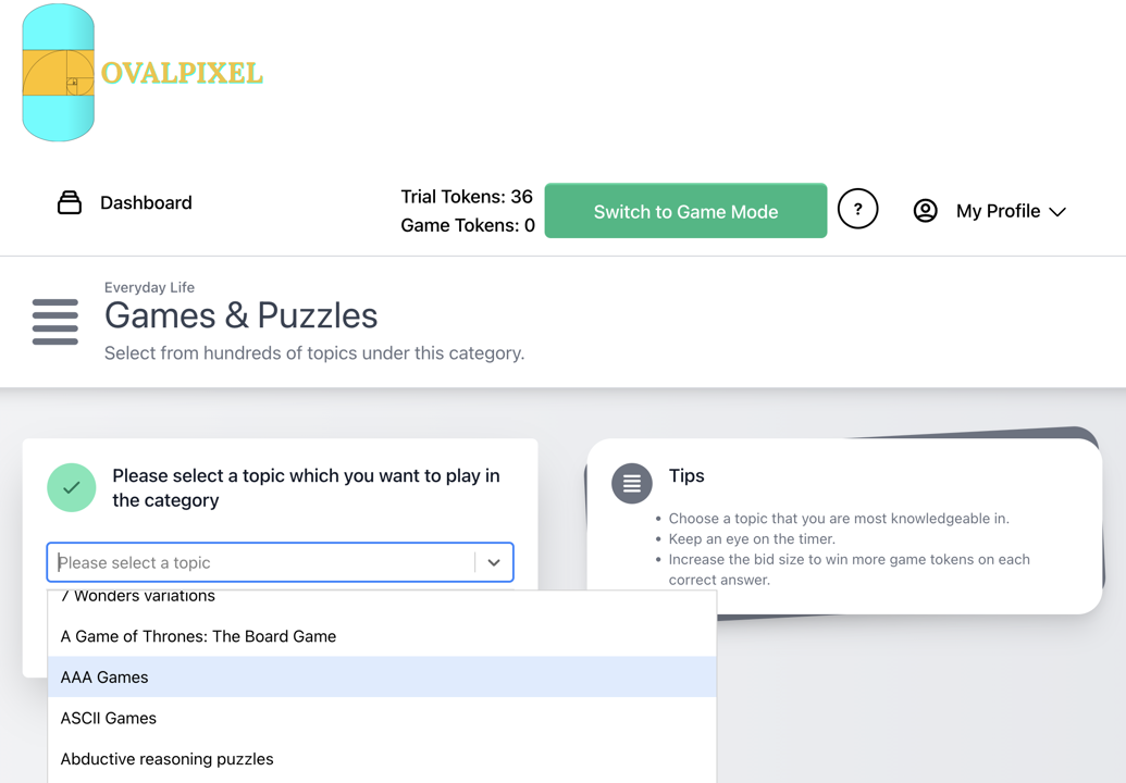 OvalPixel operates as an AI-powered trivia game. Players choose from a wide array of categories and subcategories, then answer questions within a 15-second timeframe by selecting one of four possible answers. The user needs to stake their own amount of in-game tokens for each round before starting.