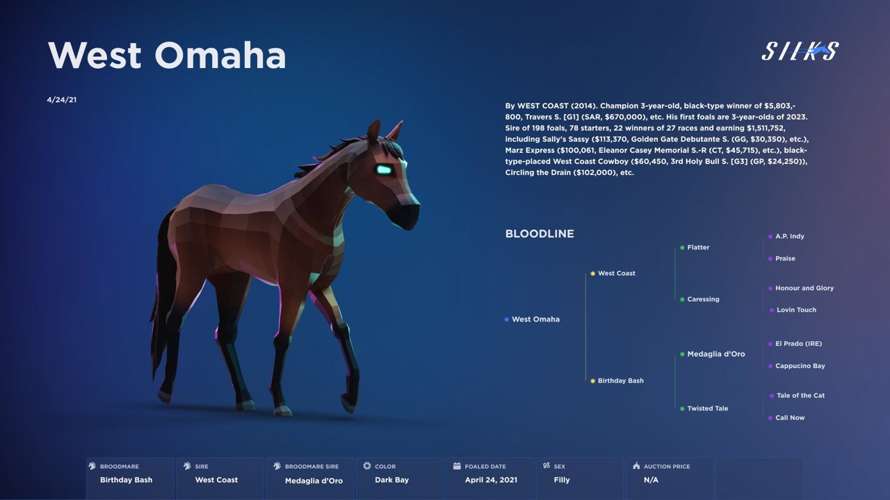 Silks truly unique is that each Silks Horse is directly linked to a real-world thoroughbred horse. Through this innovative approach, Silks Horse then tracks real-time data related to bloodlines, training progress and racing results of real-world competitors.