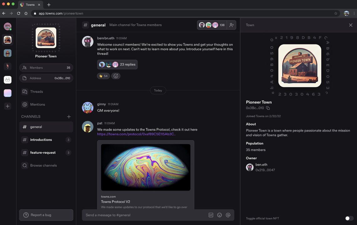 The Towns app takes all the technical things the protocol implements and makes them available in an open-source, end-to-end encrypted delightful chat experience. The experience ties together user identity and Town ownership through smart contracts representing access, moderation, privacy, and reputation. Tight integration with the web3 ecosystem directly in-app allows for new opportunities for users to interact with their communities in ways that weren’t previously possible. Everything from participating in DAO governance to on-chain game interactions to trading NFTs can occur directly in a community’s Town where the communication is already happening. While this will be the first Towns app, it will be one of many as anyone can build clients against the Towns protocol to fit their specific needs.
